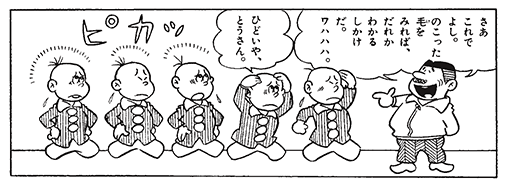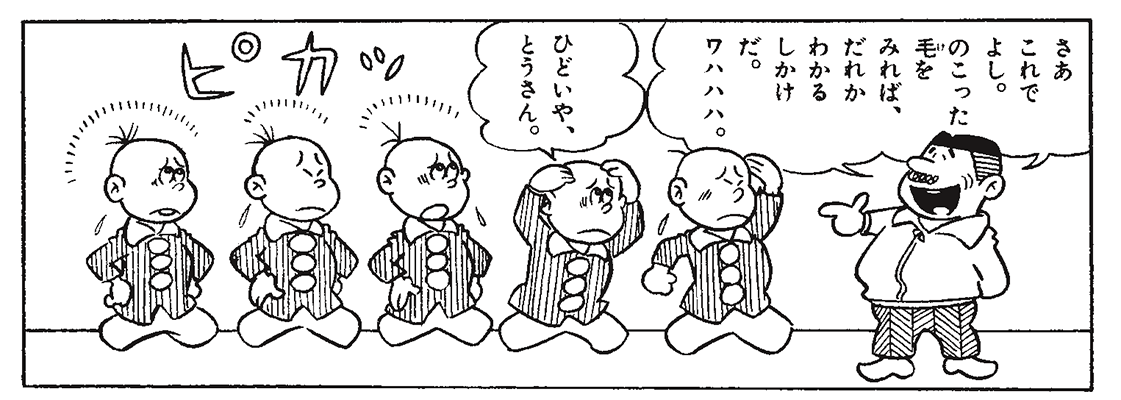 頭を刈って残した髪の毛が「一本が一松、二本はカラ松、三本はチョロ松、四本はトド松、五本は十四松…」と見分けにチャレンジ。当然六つ子は大反発!!