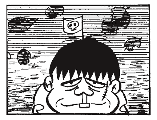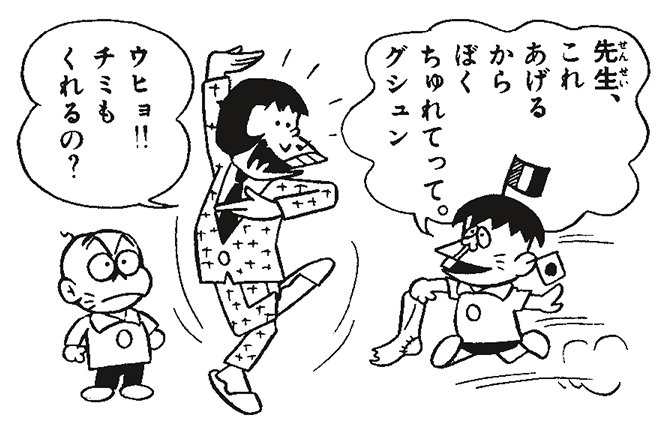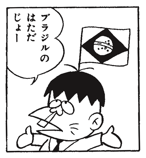 「おそ松くん」が描かれたころに子どもたちに大人気だったのがお子様ランチ。ケチャップライスの上には日の丸の旗が立っていました。赤塚センセイはそれをイメージしてハタ坊の頭に旗を立てました。その旗はお話によってブラジル国旗、フランス国旗、ドクロや音符など様々なパターンがあります。んーーー、探してみよう!
