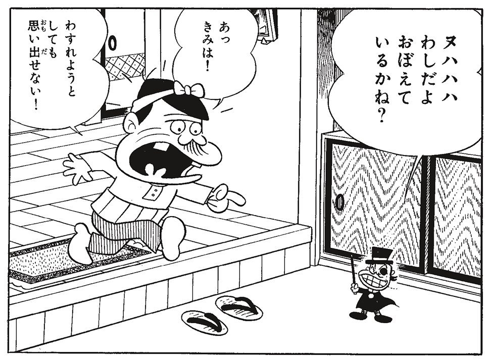 鳳啓助師匠の「忘れようとしても思い出せない」というギャグをたいへん気に入った赤塚センセイがパパのセリフに採用しました。もちろん啓助師匠もよろこんでくれました。あくまでギャグなので意味はとくにありません。んー、思い出したい!