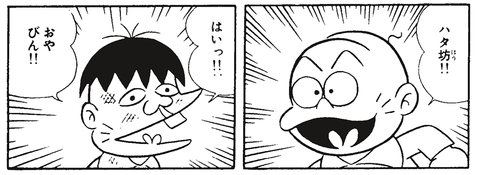 赤塚センセイによると、当時は、鼻をたらしてそれをシャツの袖口などで拭って、ほっぺたがガピガピに乾いて固まった子どもがたくさんいたそうです。それをビジュアル化したのがこの線です。その証拠にこの線はチビ太やハタ坊などのちいさな子どもにだけに描かれていま す。ヒゲのように見えますが、ヒゲではありません。んーーー、子ども時代のヒゲ?!