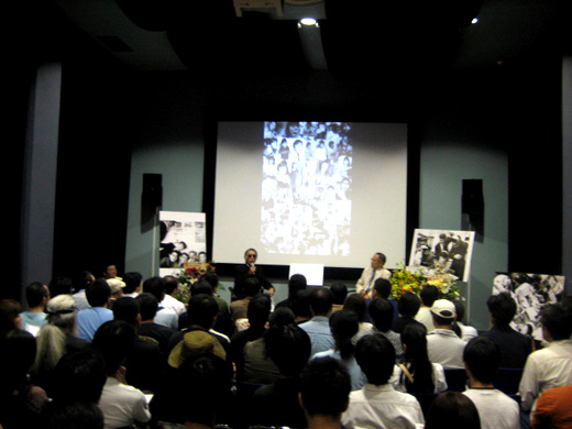 [写真2] 会場は、入場できたラッキーな方々でギッシリ。 右に鈴木伸一さん(スタジオ・ゼロ代表/杉並アニメーションミュージアム館長)、左が藤子不二雄(A)さん。トキワ荘時代から旧知のおふたりは、トークの息もピッタリ。本日は、藤子不二雄(A)さんが話し役。 |