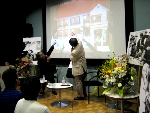 [写真4] トキワ荘の模型を大写しにして、「ここが赤塚氏の部屋。僕の部屋のななめ前だった」と鈴木伸一さん。「そう、そう。不思議なことに、僕らがいたのは2階だけで1階には1度も行ったことがない。階段があってトントントンってすぐ上がちゃうからね」と藤子不二雄(A)さん。 |