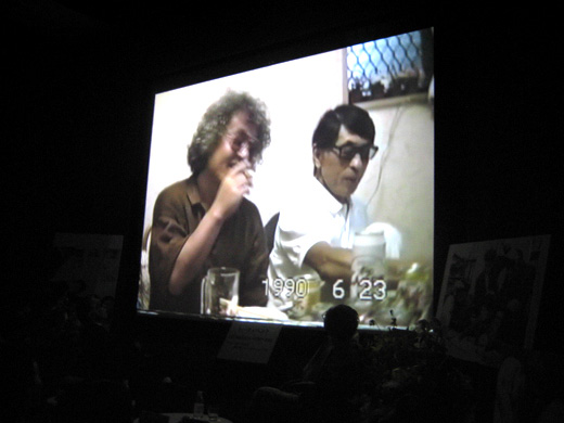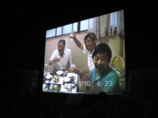 [写真5] 特別上映された鈴木伸一さんのプライベートビデオ。事実上引退して茅ヶ崎に引っ込んでしまったトキワ荘の先輩にして大恩人のテラさんこと寺田ヒロオさんをみんなで訪ねた1990年のもの。仲間が揃うとみんな穏やかで子どものような昔の顔に。左が寺田ヒロオさん、中央は藤子・F・不二雄さん。 |