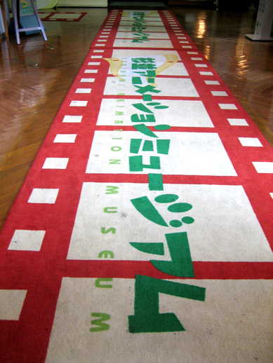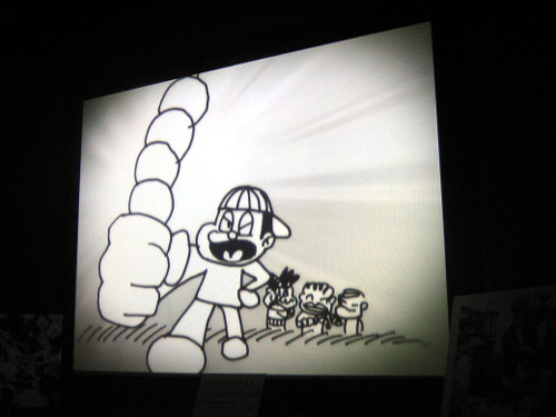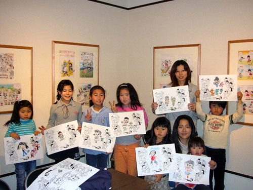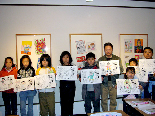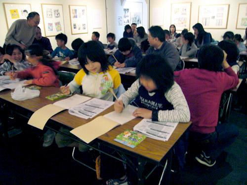 [写真1] 今回の講師は、フジオプロの吉勝太先生(左)とゲストの河口仁先生(右)。河口先生は、70年代に赤塚先生のアシスタントをしていたこともあるフジオプロの大先輩です。会場となった赤塚不二夫会館の2階は、展示してある赤塚先生の原画をそのままに机を並べた即席の教室。いいお手本がいっぱいです。 |