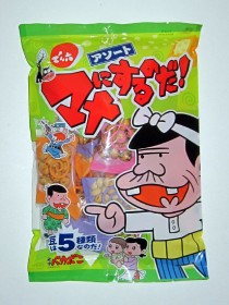 パッケージに『天才バカボン』のキャラクターたちがあしらわれ、 5種類の豆菓子がアソートになっています。
