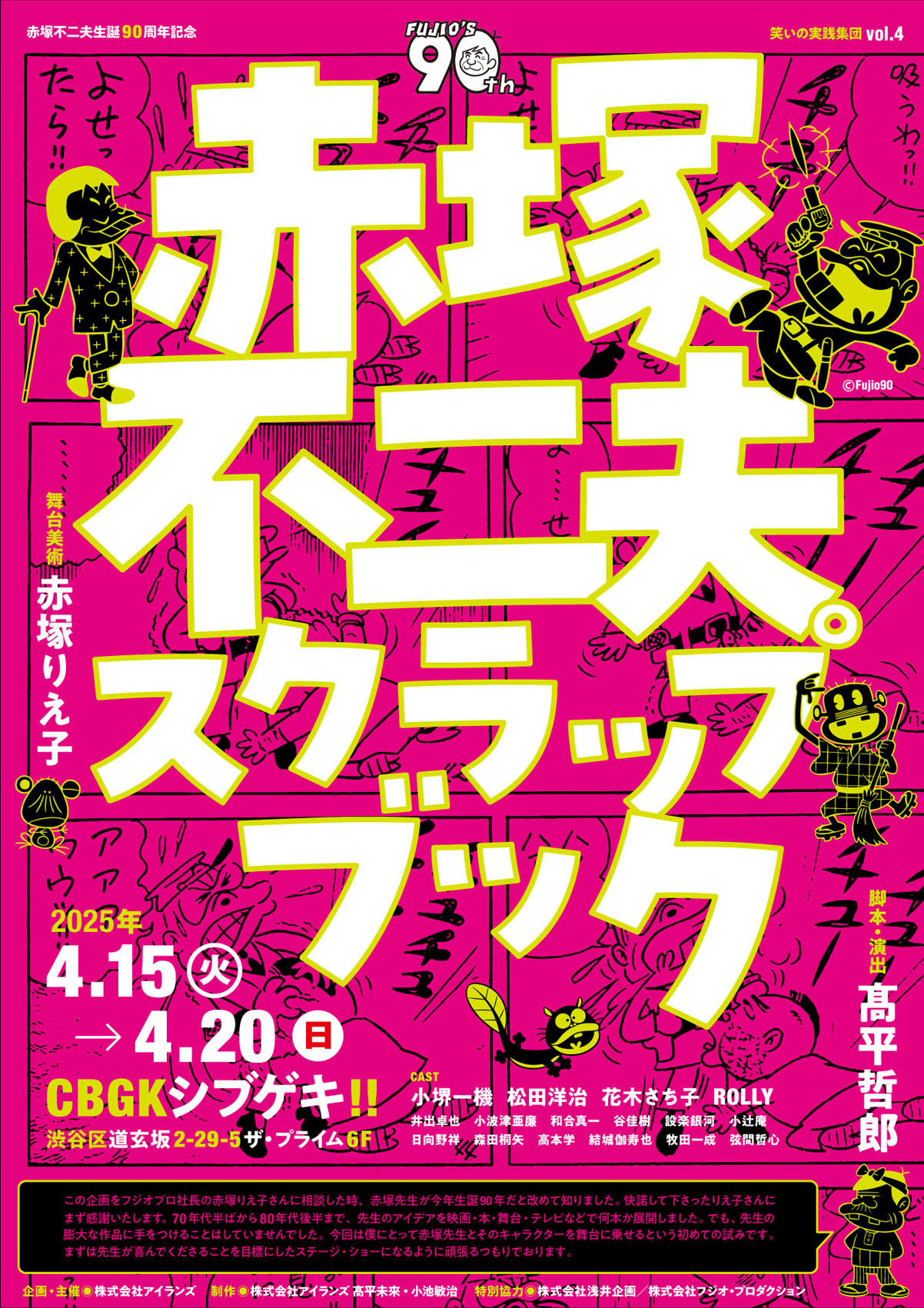 赤塚センセイの生誕90周年を記念した舞台「赤塚不二夫スクラップブック」が、 4月15日から20日まで東京・渋谷の「CBGKシブゲキ!!」で上演されます!
