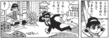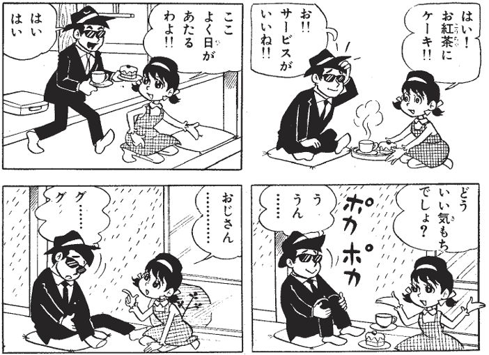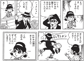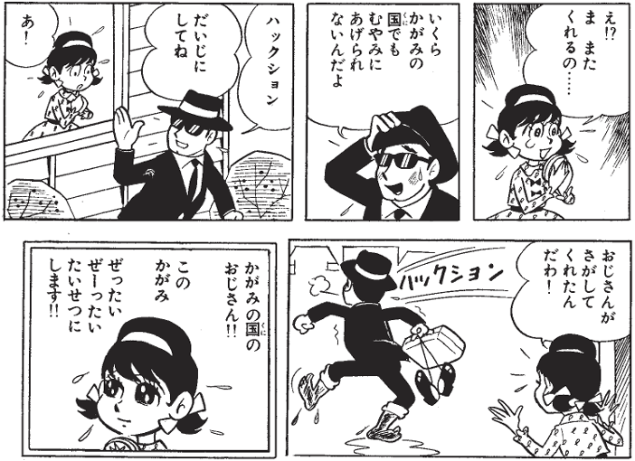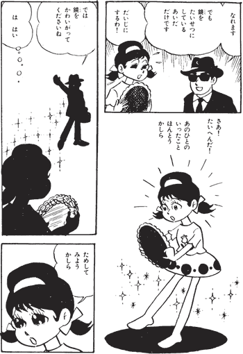 かがみの国のおじさんにとっては、ふしぎな鏡のアフターケアも大切な仕事。ある日、アッコちゃんは、溺れたガンモを助けるためにお堀に飛び込んで、もらったばかりのコンパクトを落としてしまいます。困ったアッコちゃん。すると、そこに現われたおじさんの手には、なくしたはずのコンパクトが……。おじさんが、お堀に入って探してくれたのです。