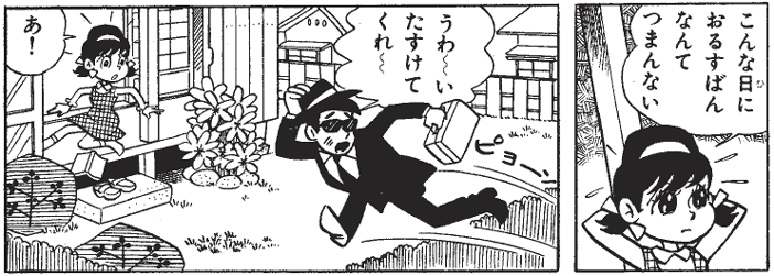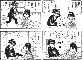 ダークスーツにサングラス、そしてソフト帽と、スパイのような出で立ちのかがみの国のおじさん。初めてアッコちゃんに出会ったとき、ひみつの鏡を渡して立ち去る後ろ姿は、まるで映画のワンシーンようです。かっこ良くて、スマートで謎の多い、魅力的なおじさん。