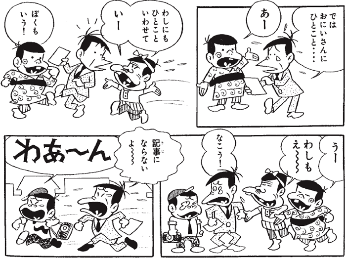 天才赤ちゃんのハジメちゃんを取材に来た記者に対しても、まったく動じることなくこの態度。パパといっしょに記者を煙にまいてしまいました。どこまでもマイペースで堂々としたバカボンは、大物感すら漂います。