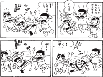 ハジメちゃんが、誰かに誘拐された?!もちろんこれは、パパとバカボンの勘違い。ふたりはまるで遊んでいるように見えますが、内心は大真面目。これでも一生懸命にハジメちゃんを心配しているのです。たとえ、そうは見えなくても!