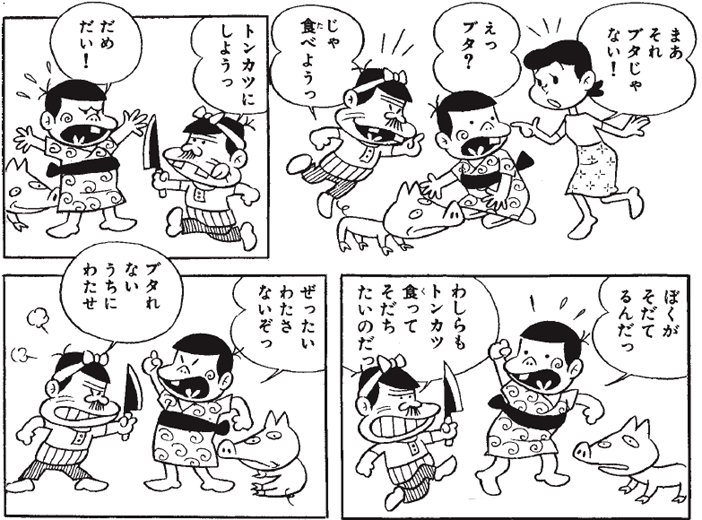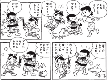 ネコと間違えてブタを拾ってきたバカボン。トンカツにして食べてしまおうというパパに対して、身体を張ってブタを守ります。バカボンは、自分を通すガンコな一面も持ちあわせていますが、決して損得勘定で動かない、弱いものや小さなものを愛するやさしい男の子です。