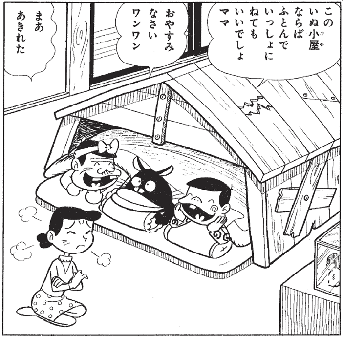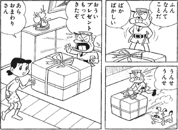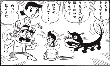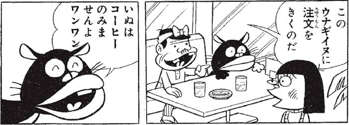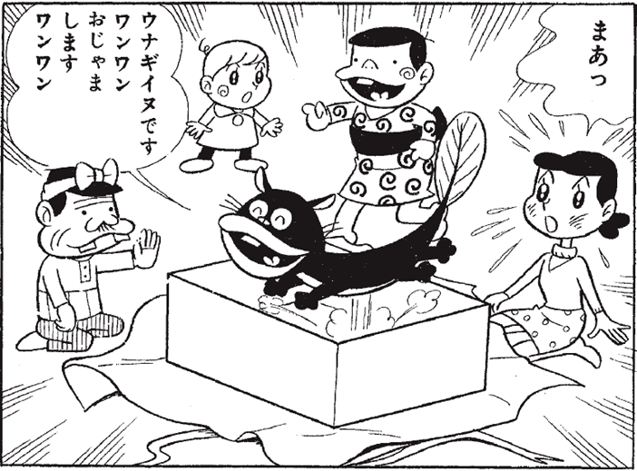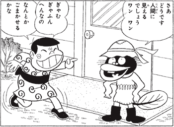 ひどい風邪をひいたパパは、ウナギイヌがそばにいないとクスリを飲まないとわがままをいいます。イヌは、病院に入れないと断られたバカボンは、ウナギイヌに洋服を着せてニンゲンに見えるように変装させます。2本足で立ったウナギイヌ、ニンゲンに見えますか?