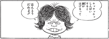 へんな子ちゃん流の「いじわる必勝法」を伝授しましょう。まずは、突然ハゲ宣告をします。相手は誰でもかまいません。ポイントは、自信に満ちた断言口調。これでつかみはOKです。