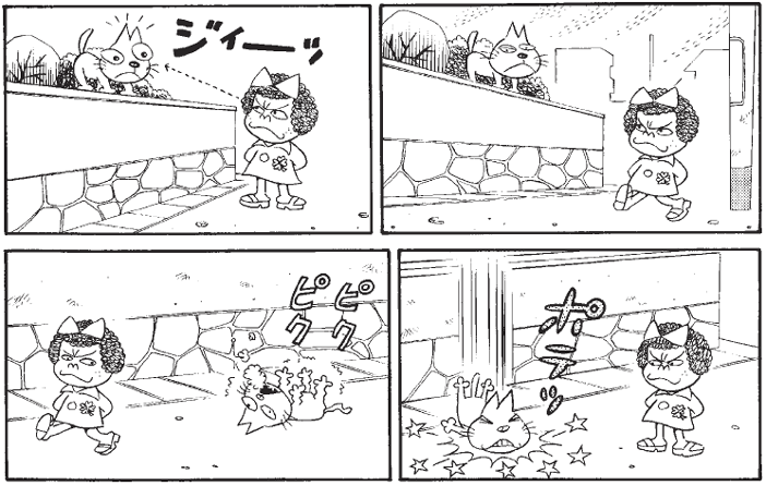 塀からネコを落とすぐらい、お茶の子サイサイ!ちょっとしたいたずら心から超能力の力試しです。へんな子ちゃんの超能力は、きょうも絶好調。気絶したネコを横目に見ながら「さて、次は何をしようかしらん?」。