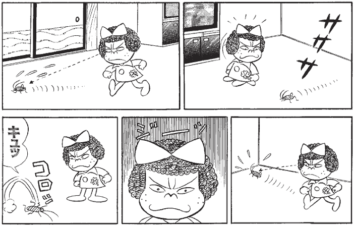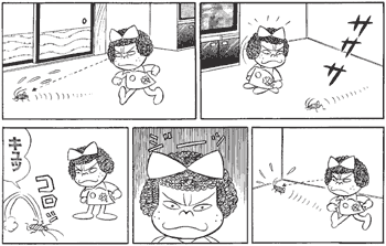 へんな子ちゃんの部屋に迷い込んだのが運の尽き。殺虫剤より強力な超能力パワーで、ゴキブリちゃんもコロッとご臨終です。それにしても、ゴキブリが出ても動じない沈着冷静な態度には、驚かされるばかりです。