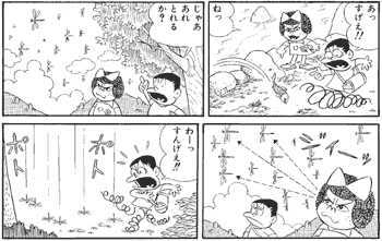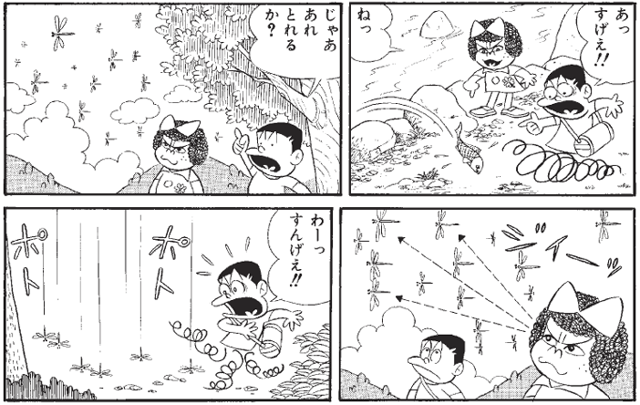 へんな子ちゃんの超能力は、田舎でも威力は衰えません。魚も群れをなして飛び回るトンボも、へんな子ちゃんにかかれば、はいこの通り。「ポトポト」と大群のまま落ちてきます。田舎の子どももびっくりです。