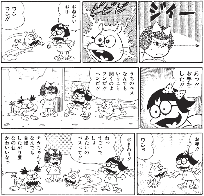 イヌ相手にも実力発揮。なかなか「お手」が覚えられなかったチカちゃんの家のペスも、一瞬にして「おりこう犬」に変身です。この日のへんな子ちゃんは、チカちゃんに自慢されてもおだやかな顔をしています。