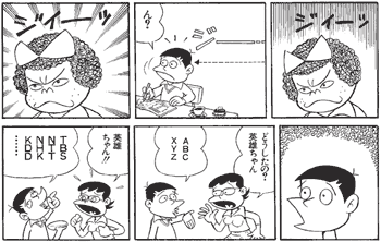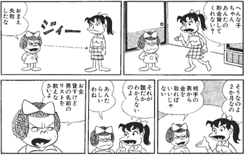イヤミな秀才・秀雄くん。へんな子ちゃんの視線を感じた瞬間に、もう顔つきが変ってしまいました。何を聞いても意味不明。今までの努力がすべてパアになって、アホ街道まっしぐらです。ざんねーーーーん。