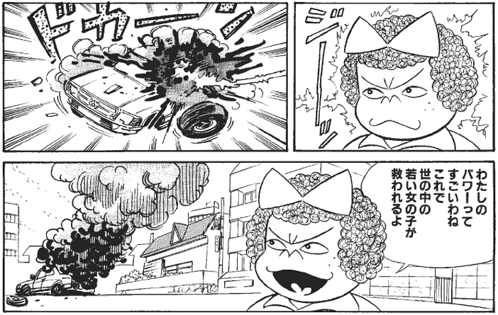 女の敵である結婚詐欺師のクルマを超能力で破壊!ここまで行くと、実は立派な犯罪行為ですが、勧善懲悪ということで許していただきましょう。全若い女性の味方、たいへん頼もしいへんな子ちゃんです。