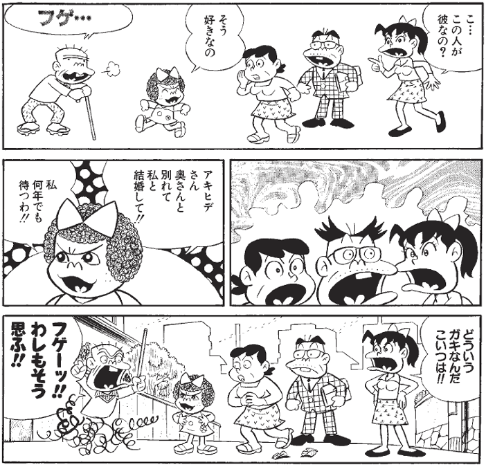 よほどのことでは動じない家族も、へんな子ちゃんの恋の相手にはビックリ。さらにおじいさん(アキヒデさん!)に妻との離婚まで要求。へんな子ちゃん、目を覚ませ!相手は、孫もひ孫もいるヨボヨボじいさんだよ!