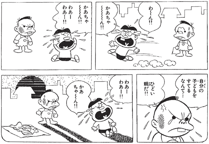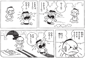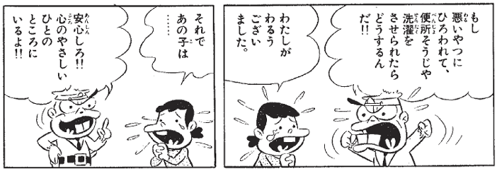 翌日、ヤス男を捨てた母親は、後悔して交番にやってきます。おまわりさんのお説教に涙を流してわびますが、たとえどんな事情があっても、子どもを捨てちゃダメです。
