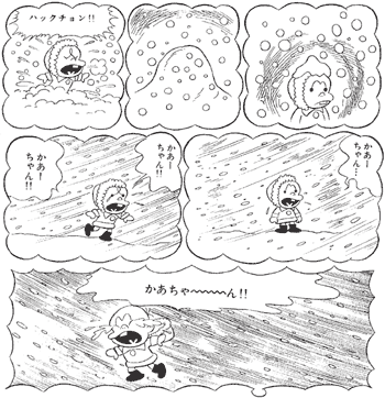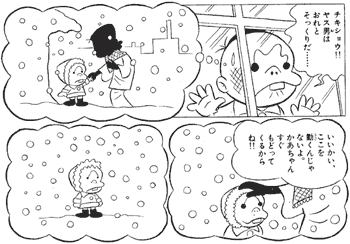 夜中になると母親を思い出して泣き出すヤス男。そんな姿を見ていると、のらガキもヤス男と同じように親に捨てられたときのことを思い出します。それは、雪の降る日のことでした。