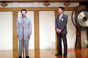 ホロヨイ加減のオレが壇上で挨拶するのを心配そうに見守るのは武居記者。「大丈夫だってば!」
