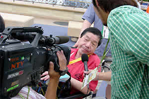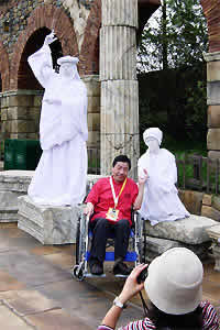 この日はオープン前の招待日のためか、入り口でどこぞのワイドショーのクルーが待ち構えていて、芸能人や各界の有名人を狙っていた。さっそくオレのところにもやって来たけれど、まだ何にも見てないんだからコメントしようがないよ。まぁオレが車椅子だったもんだから、目立ったのかもしれないけれど。コレは真知子の発案(陰謀?)で、オレを歩かせるとすぐに疲れて「帰ろうよ~」っとなることや「あっちで酒、飲めるぞ~」っと勝手な行動を取ることを事前に阻止するための対策らしい。オレも、これならラクチンで誠にケッコーだ。それにもしかしたら、あれこれ並ばなはくても先に乗せてくれるかもしれないしな。