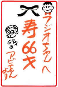 お祝いにきてくれました、アビちゃん。言わずと知れた藤子不二雄A先生なのだ。トキワ荘で出会って以来、かれこれ40年のおつき合いとなりました。
