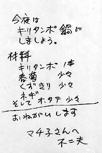 今晩のアカツカ家はオレが仕切ることにしました。が、ちょっと手抜きをして真知子におつかいをお願いしました。