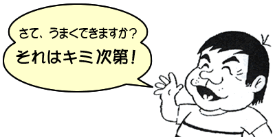 なにを食べるかを決めて、自分で材料を仕入れて(買い物に行く)、自分で料理を してみなさいってコト。オレは自慢じゃぁないけれど、なんでも作るぞ。簡単なものばかりだけれど、スパゲティだってスイトンだって、スープだって、オレのギョーザは美味くて有名!初めて料理をするひとは下手でもいい、自分で作ってみるってのが大事なんだよ。