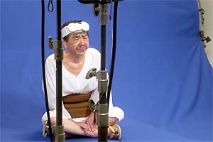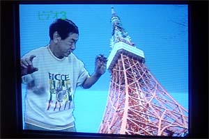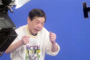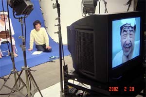 スタッフがずらり~っと7.8人はいたかな?もちろん赤岡くんと武居記者の顔も見える。かなり緊張した雰囲気の中、オレがスタスタ入っていくと、すかさずメイクさ んが「先生メイクお願いします」。「ハイよ!」と薄くドーランを塗ってもらう。ブルーバックで撮影してモニターをチェック、その場で合成画面を確認しながら撮影していく方式らしい。だけれども、オレにはその合成画面が見えないモンだからなにやってんのかサッパリわからないんだ。どうやら東京タワーをよじ登ったり、トイレに閉じ込められたり、あげくはトイレに流されたり…したらしいんだけど。ヤレ右を向け!だの、舌を出せ!だの、笑え!だの、今度は困った顔!だの、言われるままにやっている方はかなりバカっぽい。