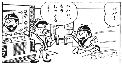 そんごくんのパパは発明家。元気いっぱいのそんごくんの頭のきんこじと宝さがしに役に立つ如意棒はパパの発明。そんごくんの足取りをテレビでモニターするハイテクパパ。