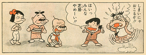 その日の配役によって家族内の役割を演じあうタレント一家。この日はおとうさんはおばあちゃんで、おじいさんはおねえちゃんで、太郎はおかあさん(ああーややこしい!)。